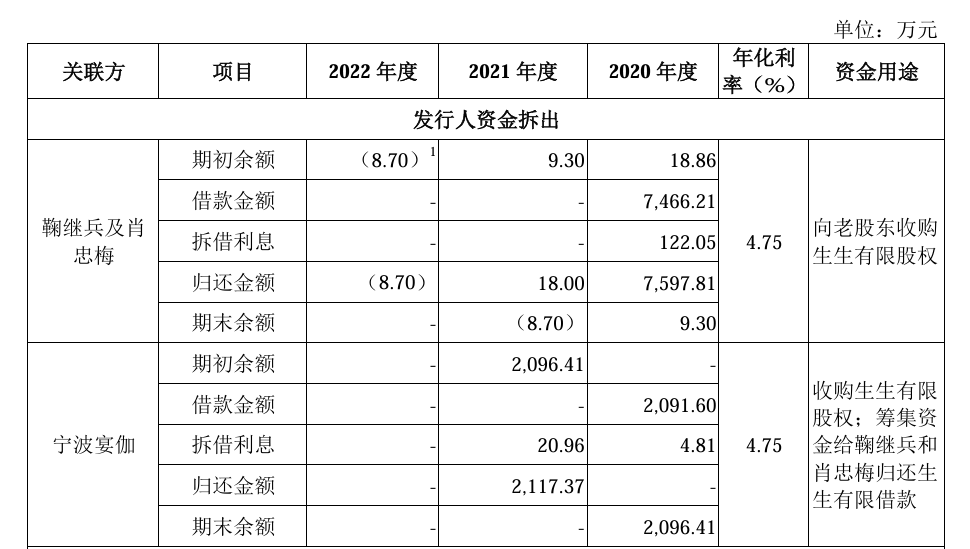 2020年,宁波宴伽向生生有限借款共计2091.60万元,其中91.60万元借款用于向老股东收购生生有限股权,2000万元用于筹集资金给鞠继兵和肖忠梅归还前述生生有限欠款。