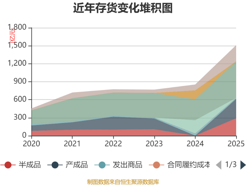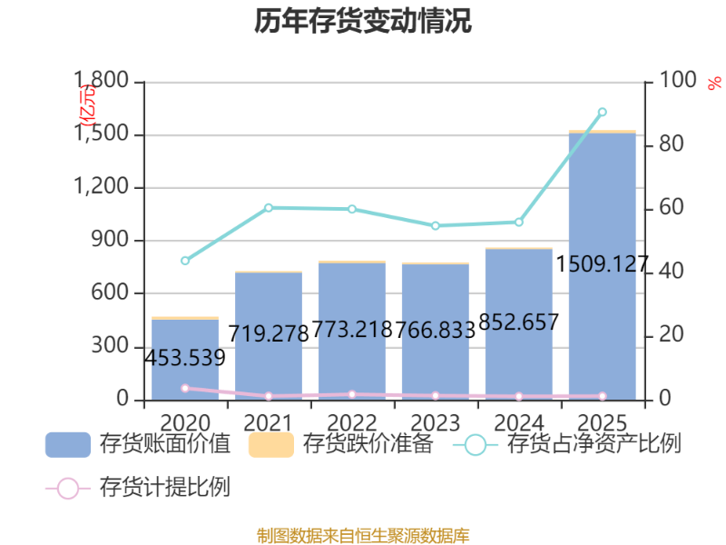 从存货变动来看,截至2025年末,公司存货账面价值为1509.13亿元,占净资产的90.49%,较上年末增加656.47亿元。其中,存货跌价准备为16.93亿元,计提比例为1.11%。
