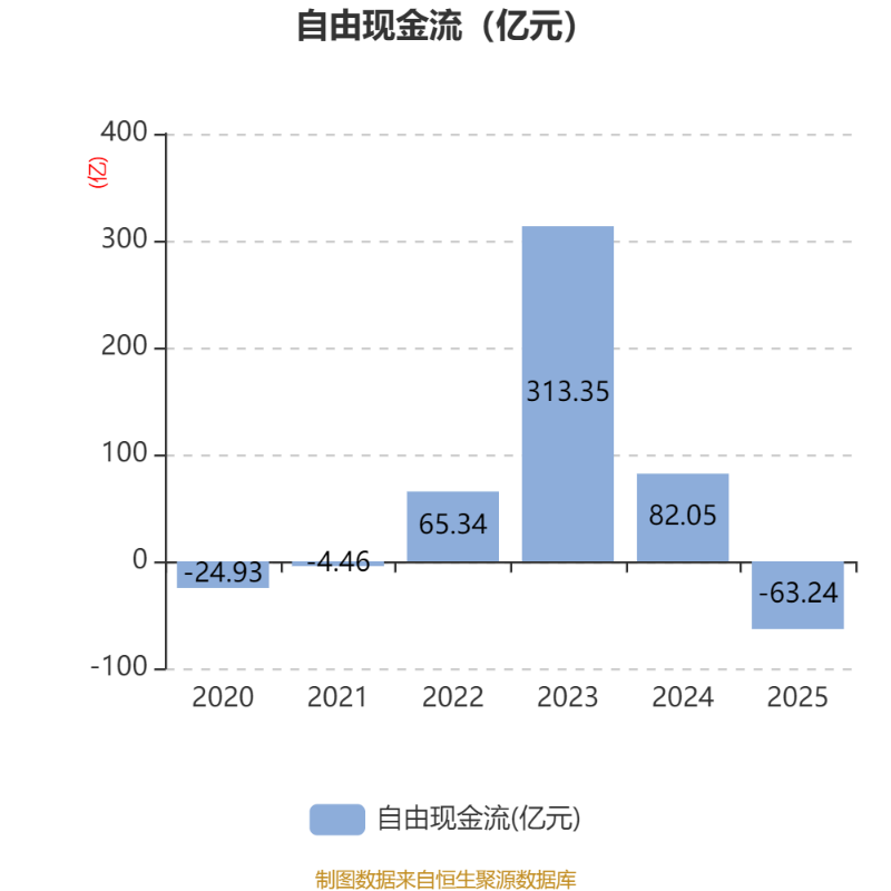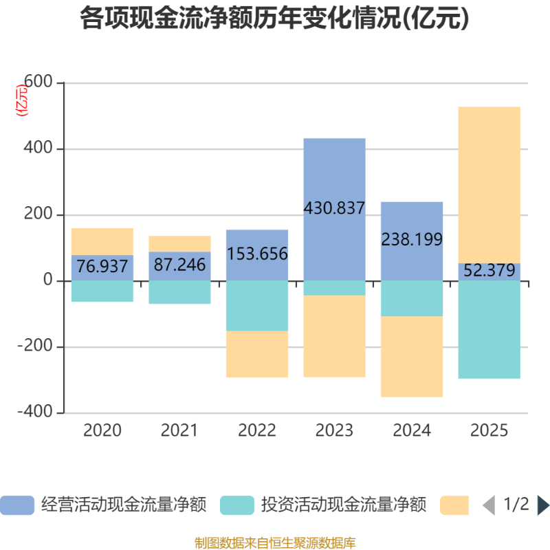 截至2025年,公司经营活动现金流净额为52.38亿元,同比下降78.01%;筹资活动现金流净额473.97亿元,同比增加718.29亿元;投资活动现金流净额-297.46亿元,上年同期为-108.98亿元。